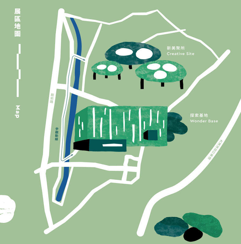 In The Wonder Base, two artists present site-specific works: Mind Map–River by Kuo I-chen and Shift Light Basin by Xin Qi. Mind Map–River places aerial photos of the Tamsui River basin from the 1960s and the early 20s side by side. Visitors are invited to construct miniature buildings on the map, transforming it into a collaborative artwork that blends reality and memory to create a shared vision map. Shift Light Basin shapes expansive landscapes of mountains and rivers using vibrant fabric bags and mixed materials. The artwork immerses visitors in a Lilliputian forest with a mystical atmosphere as they walk through the space. This installation features the dynamic interaction between humans and nature, highlighting the cycles of human intervention and natural recovery.