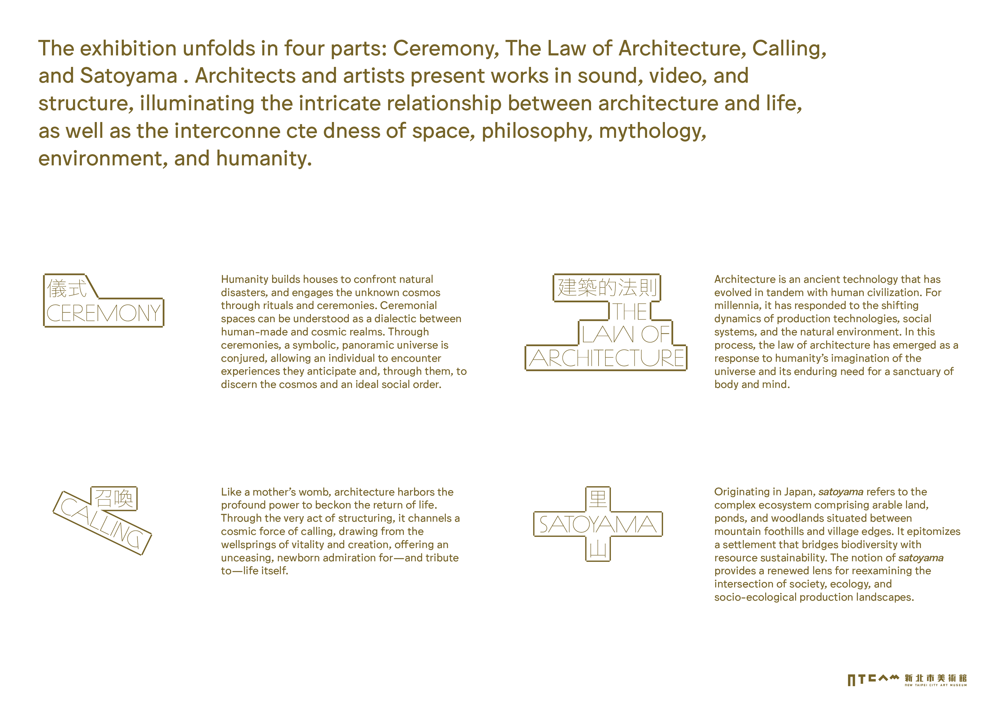 The exhibition unfolds in four parts: Ceremony, The Law of Architecture, Calling, and Satoyama. Sixteen architects and artists present works in sound, video, installation, and structure, aspiring to illuminate the intricate relationship between architecture and life, as well as the interconnectedness of space, philosophy, mythology, environment, and humanity.