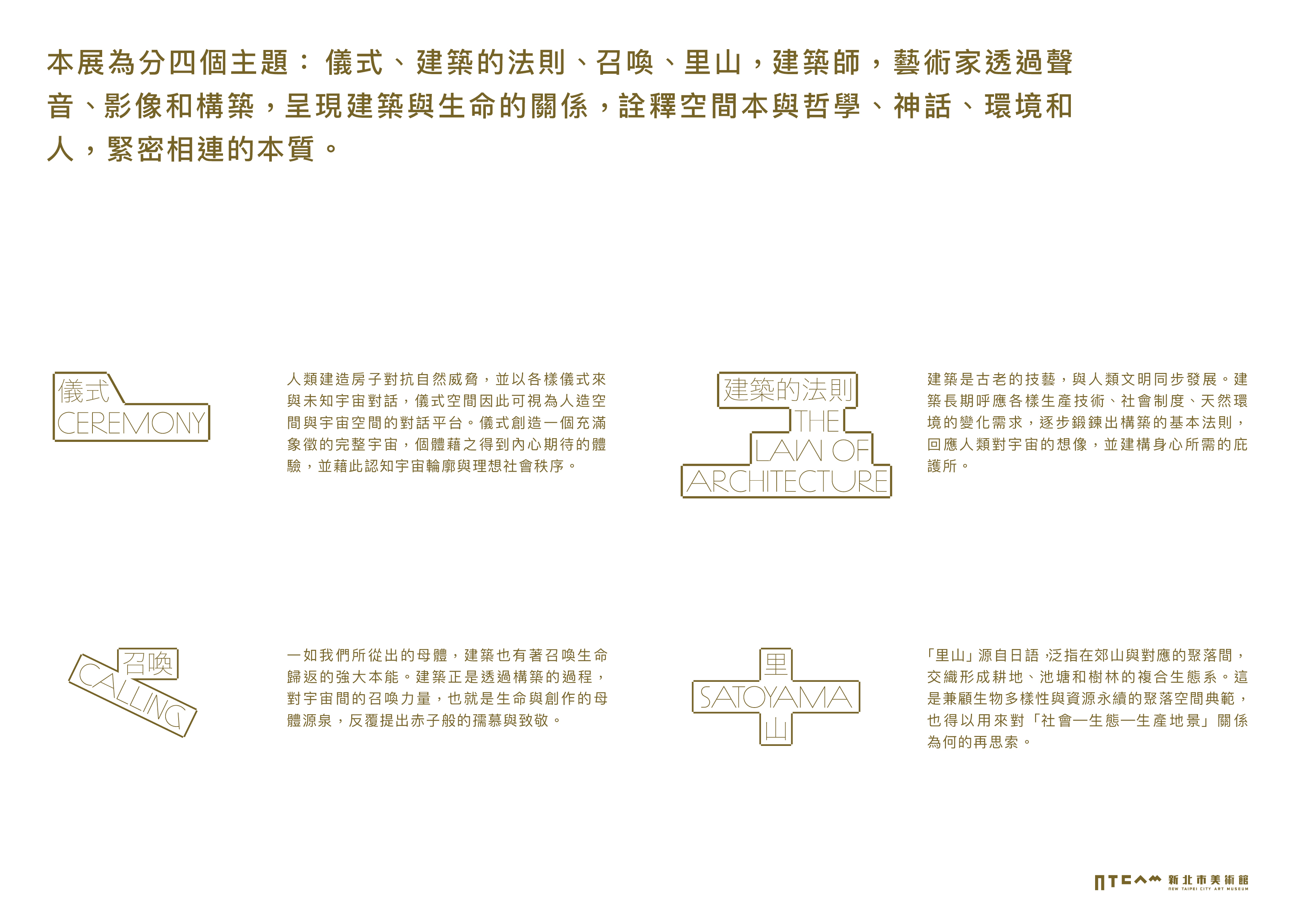 展覽因此分成四個主題:儀式、建築的法則、召喚、里山,邀請16組建築師/藝術家,透過聲音、影像、裝置和構築的創作,呈現建築與生命的複雜關係,也詮釋空間本與哲學、神話、環境和人,從來就緊密相連的廣義本質。