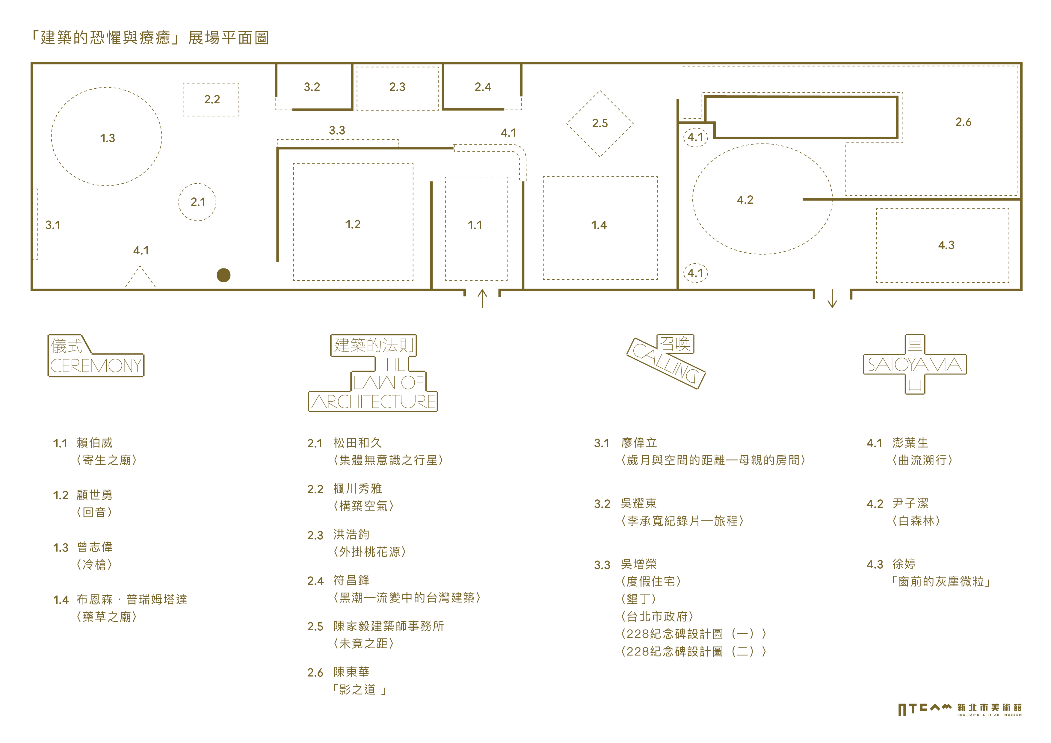 展覽因此分成四個主題:儀式、建築的法則、召喚、里山,邀請16組建築師/藝術家,透過聲音、影像、裝置和構築的創作,呈現建築與生命的複雜關係,也詮釋空間本與哲學、神話、環境和人,從來就緊密相連的廣義本質。