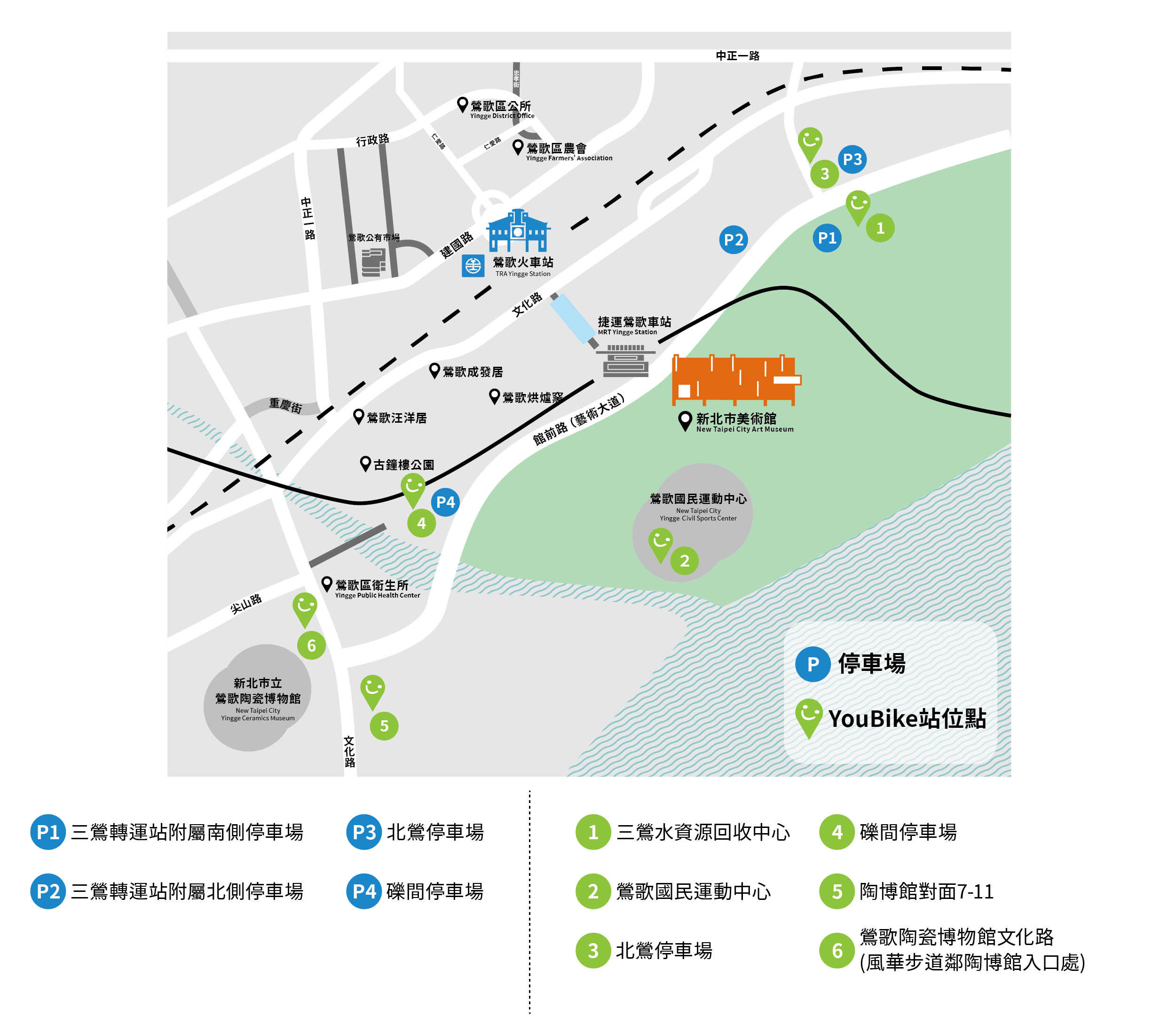 至「鶯歌火車站」下車,穿越火車站建築後,由文化路出口至對向「捷運通廊」,步行6分鐘即可抵達。